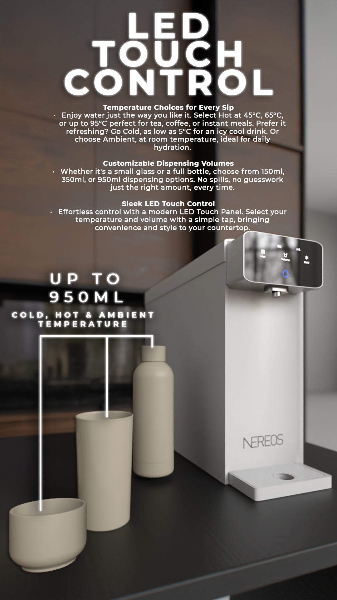 Dispense 150 ml, 350 ml, or 950 ml instantly with a single tap.