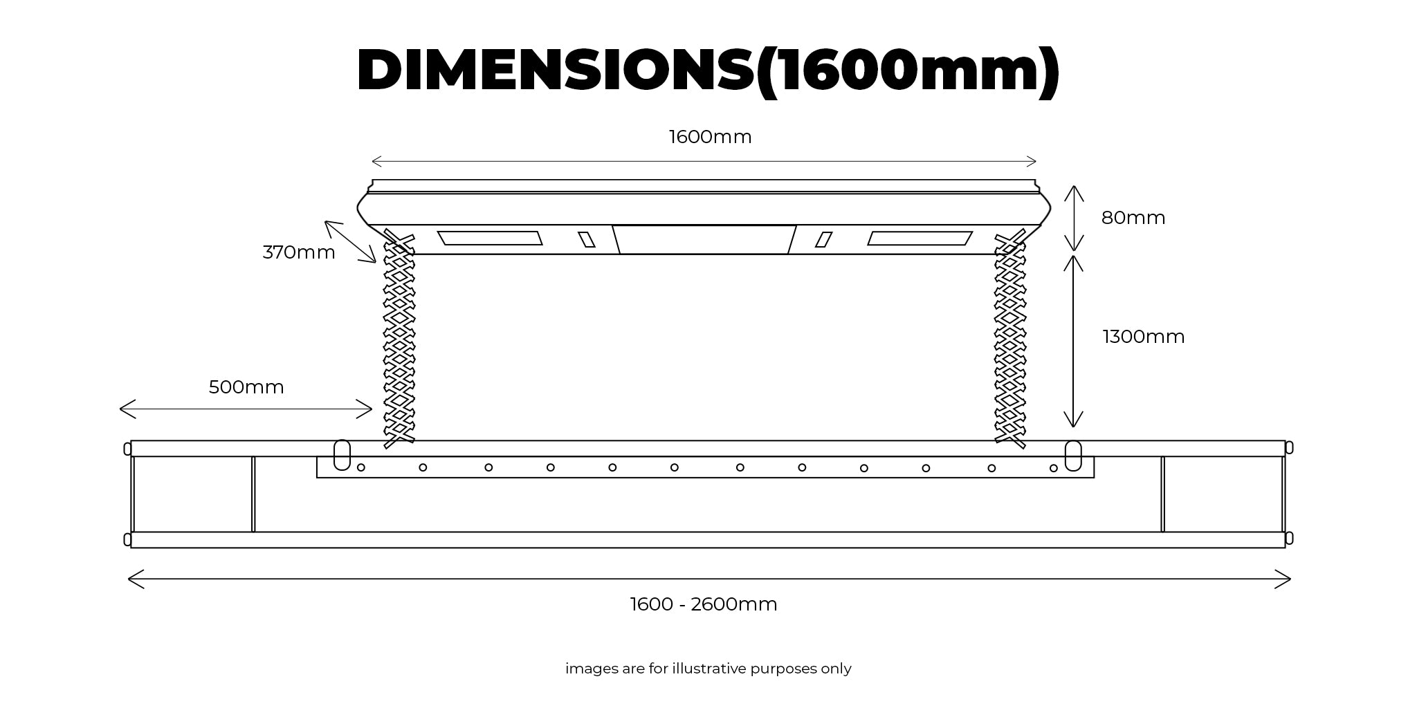 - 1600mm to 2600mm x 560mm x 250mm(drop down pole)